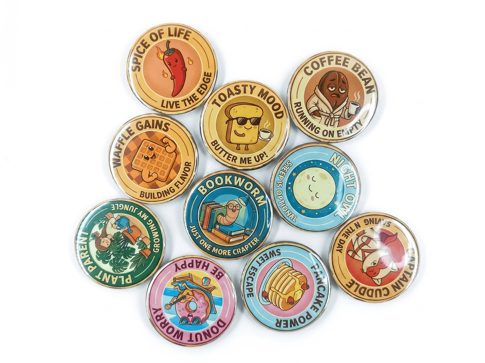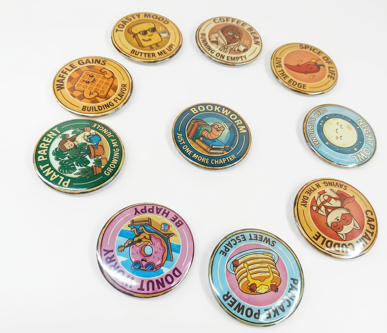 Bring charm and creativity to your everyday spaces with our premium circular fridge magnets. Crafted with high-quality materials and finished with a glossy, vibrant print, these magnets feature adorable cartoon-style food characters paired with witty and relatable phrases like “Toasty Mood,” “Coffee Bean – Running on Empty,” and “Bookworm – Just One More Chapter.”